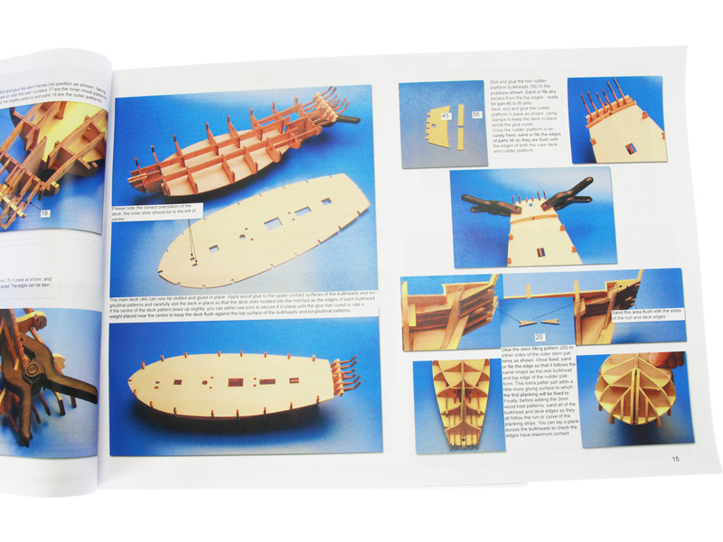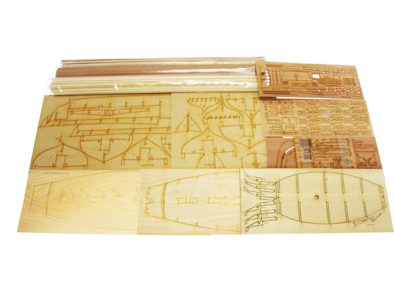 Balení obsahuje laserem řezané dřevěné díly, plaňky, paluby, stožáry, doplňky z resinu, dekorace, mosazné kování, plachty. Podrobný obrázkový manuál EN a stavební plány.