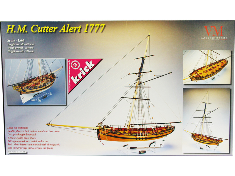 Stavebnice modelu lodi Vanguard Models H.M. Cutter Alert 1777 v měřítku 1:64. Stavba převážně ze dřeva s drobnými doplňky, laserem řezané díly, mosazné kování. Model s velkým množstvím detailů. Výhodou stavebnice je detailní obrázkový manuál kroku pro kroku.