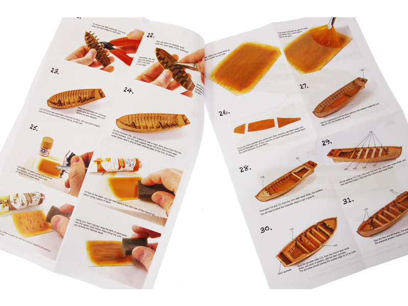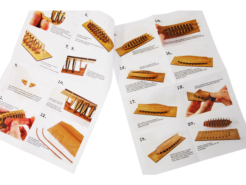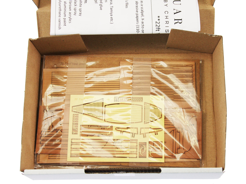Po otevření víka krabice naleznete dřevěné díly modelu z překližky, sadu mosazných plošných dílů, sadu výkresů a manuál.