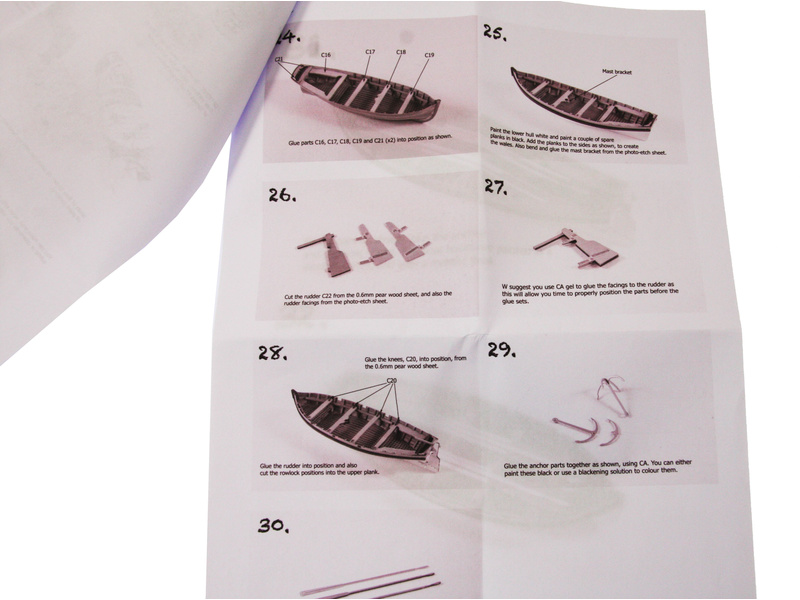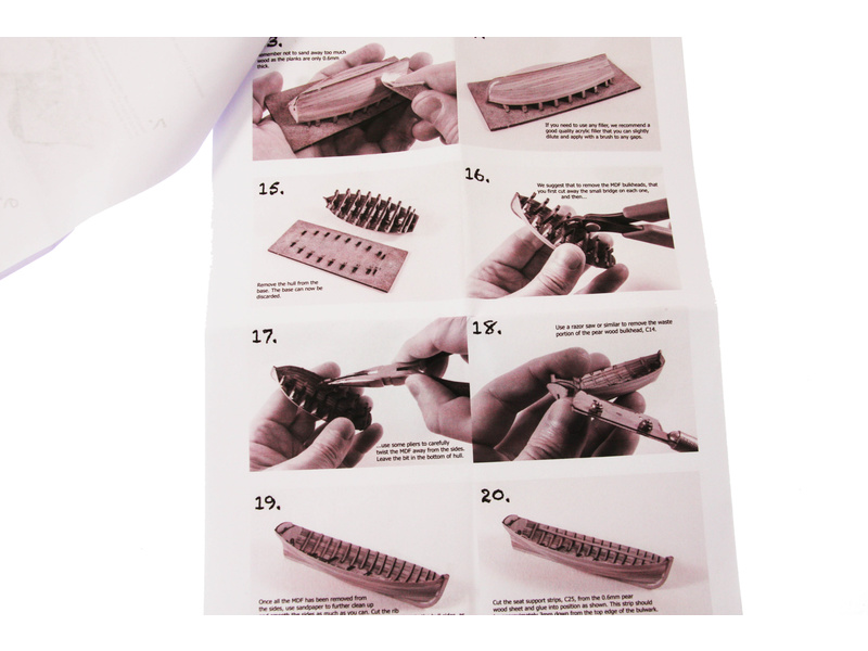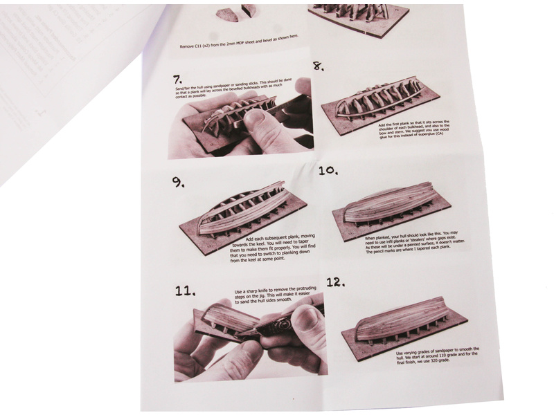 Balení obsahuje sadu překližkových dílů, díly z mosazi, stavební desku s výřezy pro stavbu kýlu a kostry a manuál EN.