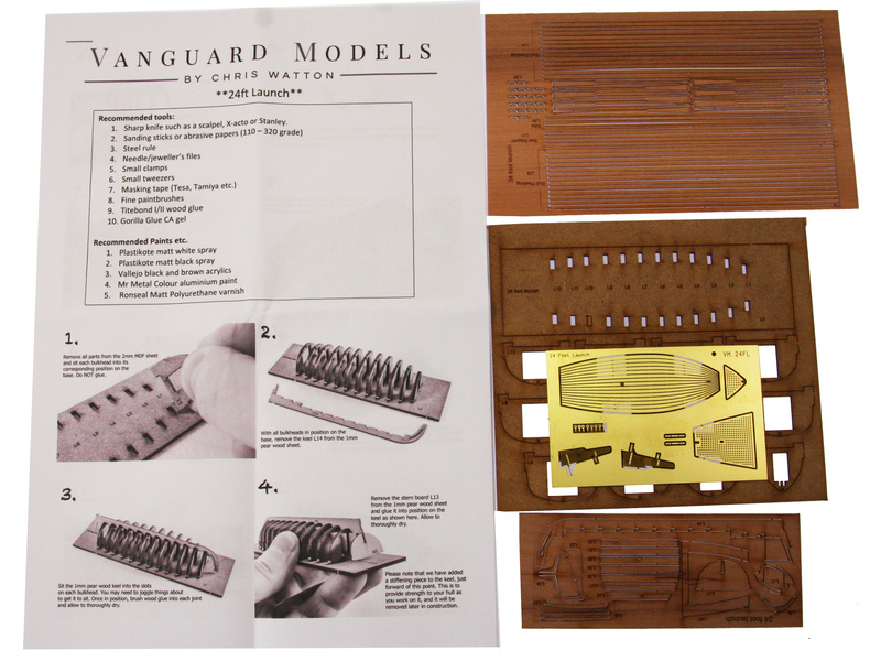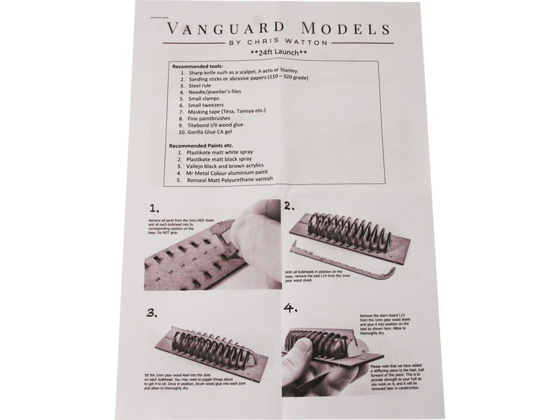 Stavebnice modelu lodi Vanguard Models - Launch člun v měřítku 1:64. Délka modelu lodi je 114mm, stavba převážně ze dřeva s drobnými doplňky, součástí je i stavební plán. Obrazový manuál krok za krokem