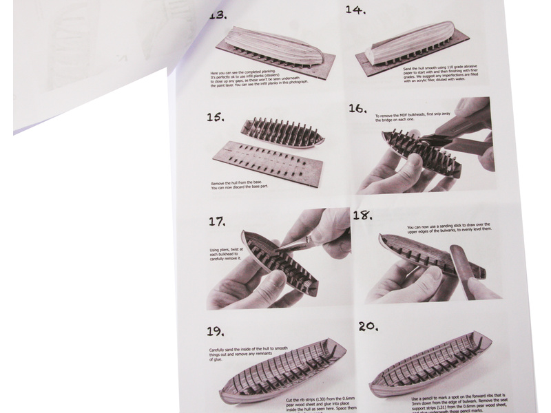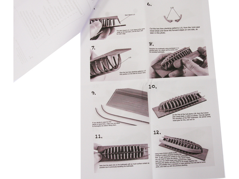 Balení obsahuje sadu překližkových dílů, díly z mosazi, stavební desku s výřezy pro stavbu kýlu a kostry a manuál EN.