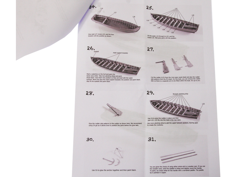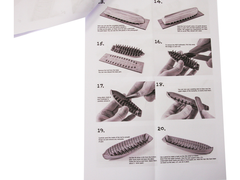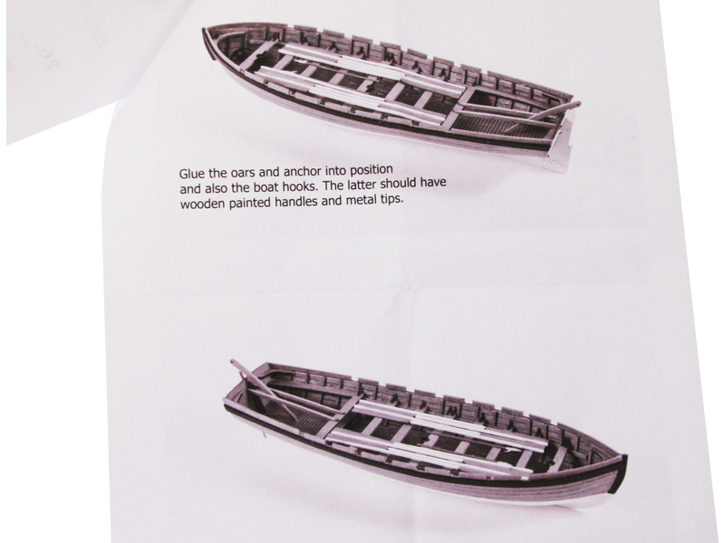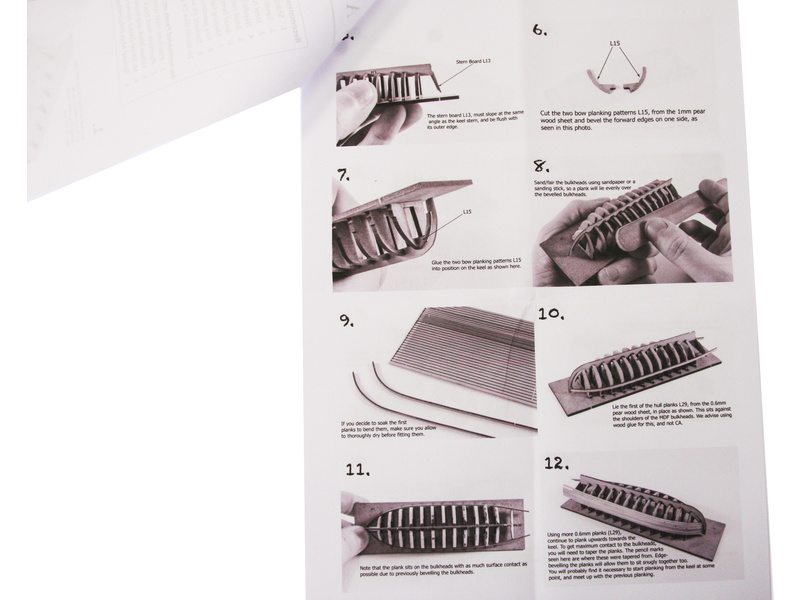 Balení obsahuje sadu překližkových dílů, díly z mosazi, stavební desku s výřezy pro stavbu kýlu a kostry a manuál EN.