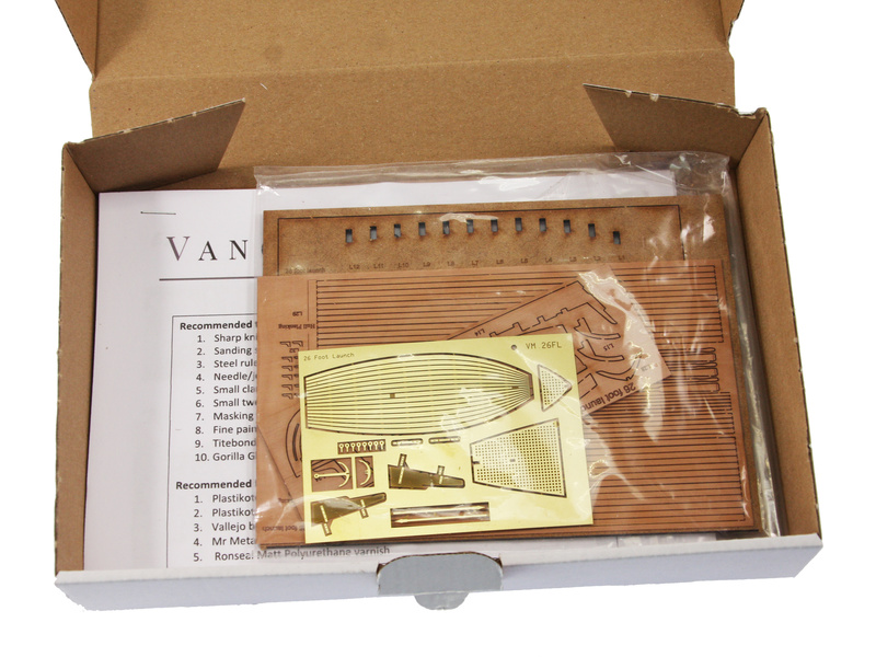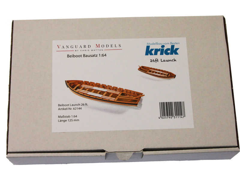 Stavebnice modelu lodi Vanguard Models - Launch člun v měřítku 1:64. Délka modelu lodi je 125mm, stavba převážně ze dřeva s drobnými doplňky, součástí je i stavební plán. Obrazový manuál krok za krokem