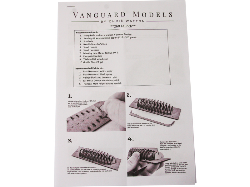 Stavebnice modelu lodi Vanguard Models - Launch člun v měřítku 1:64. Délka modelu lodi je 125mm, stavba převážně ze dřeva s drobnými doplňky, součástí je i stavební plán. Obrazový manuál krok za krokem.