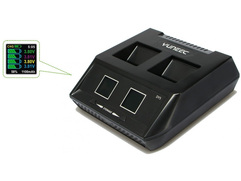 S duální nabíječkou DY5 můžete rychle a snadno nabíjet dvě baterie YUNEEC TYPHOON H3 současně. Dva samostatné barevné TFT displeje vás informují o době nabíjení, napětí článků a kapacitě. Oproti nabíječce dodávané k dronu, tato nabíječka nabíjí proudem 6Ah a umožňuje LiPo baterie převést do režimu Storage, tedy na skladovací napětí.