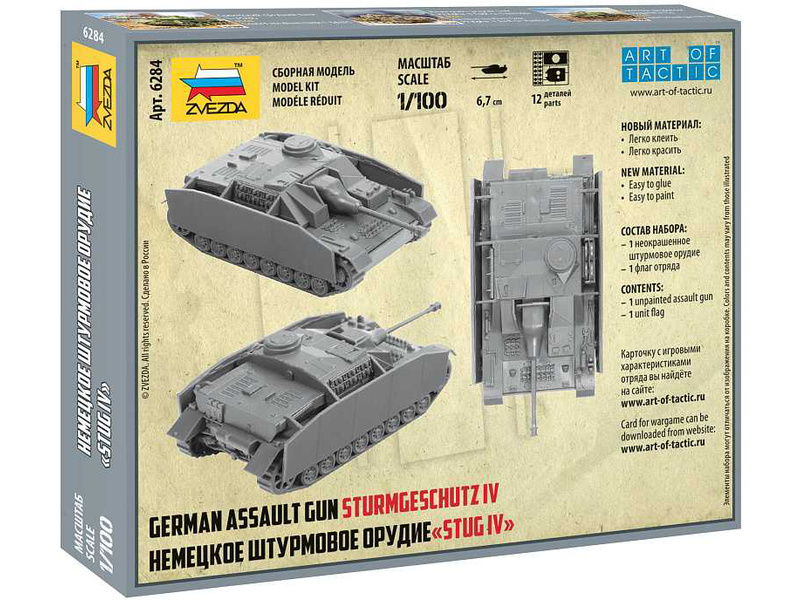 Plastikový model Zvezda 6284 - Německé samohybné dělostřelectvo "Stug IV" v měřítku 1:100. Stavebnice obsahuje 12 dílků, délka 67 mm.